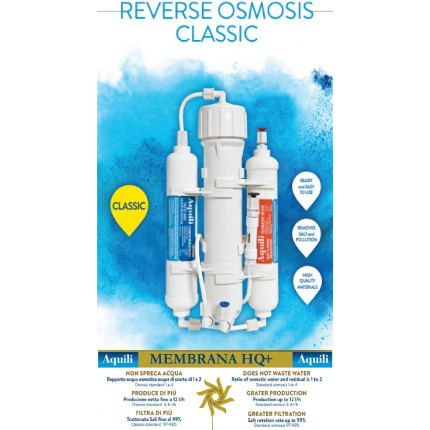 Savršeno za akvarijume – Reverzna osmoza Aquili Classic uklanja 98-99% nečistoća (provodljivost 10-40 µS) uz sedimentni, ugljeni filter i TFM membranu. Ventil za ispiranje povećava efikasnost. Pogođno i za druge potrebe.