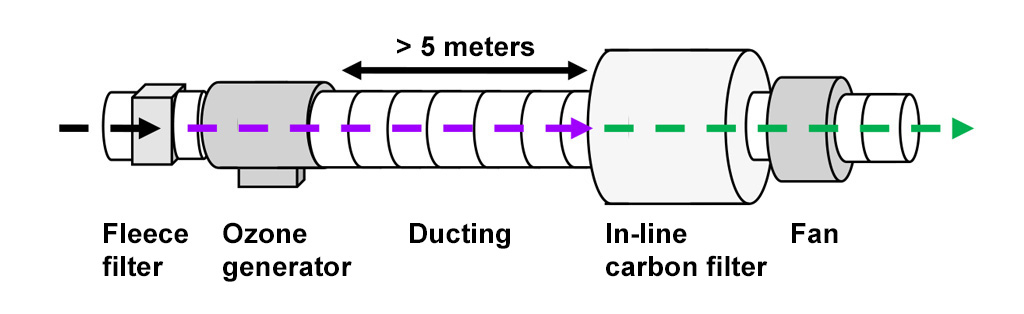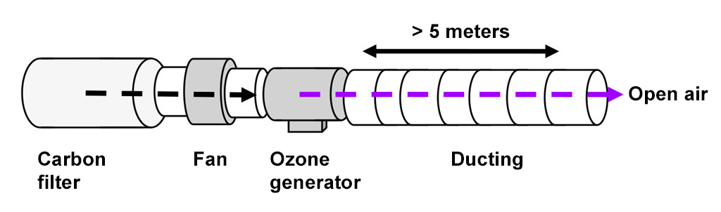 Višak ozona se može neutralisati ugrađenim aktivnim ugljenim filterom na izlazu ventilacionog sistema. Ugljen zaustavlja ozon i razlaže ga nazad u kiseonik.