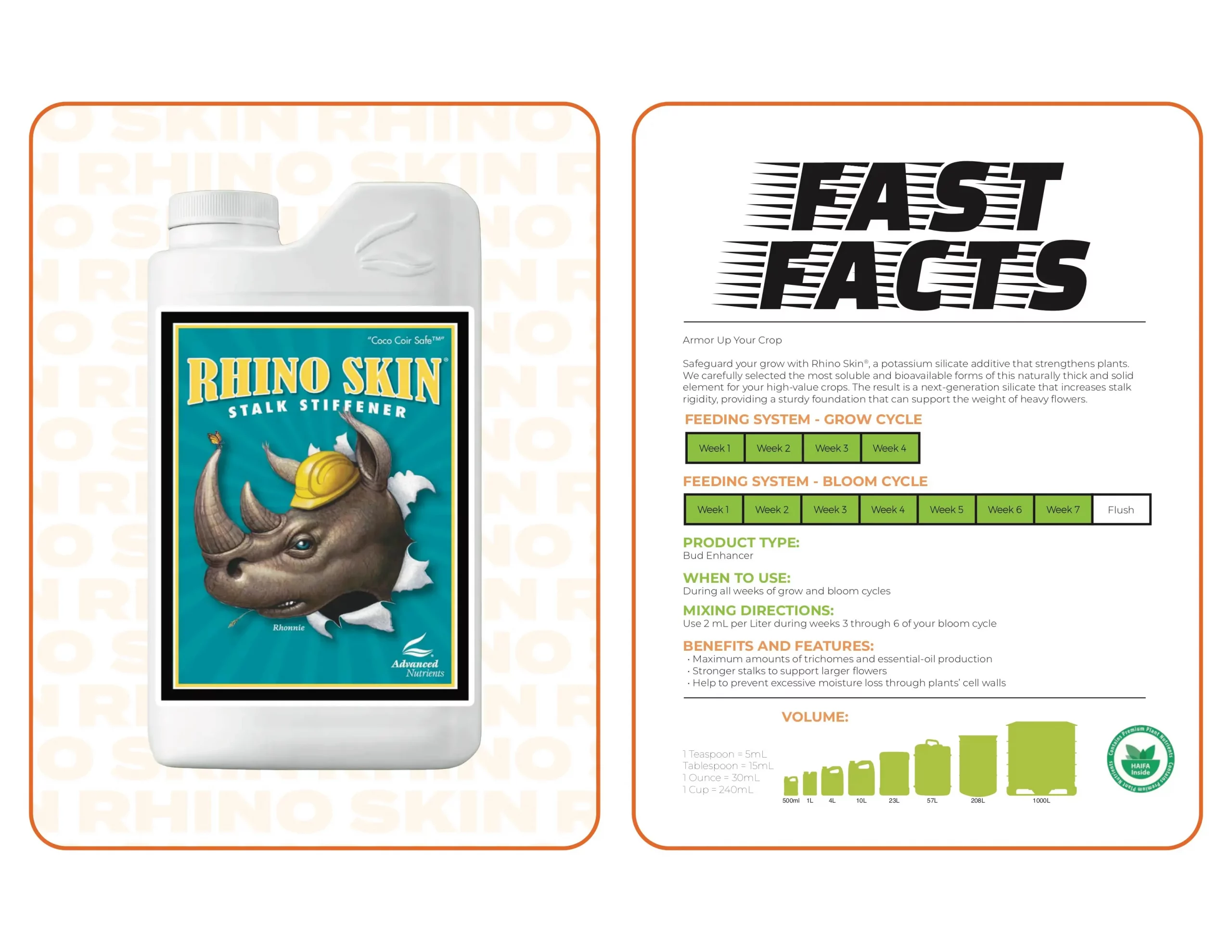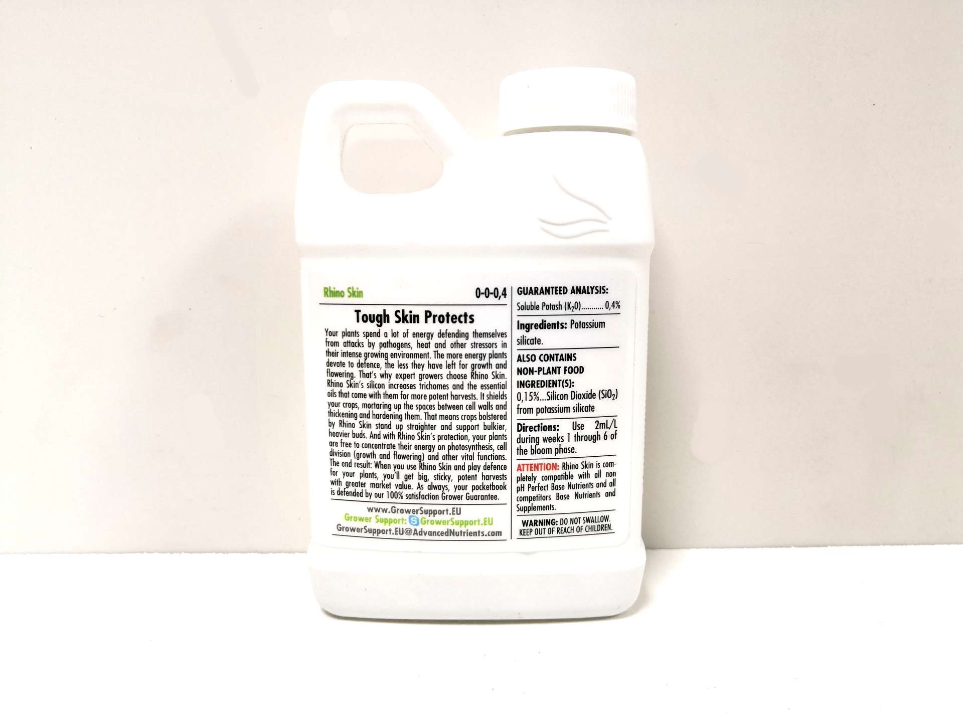 Advanced Nutrients Rhino Skin je vrhunski dodatak ishrani za biljke na bazi kalijum silikata (potassium silicate), specijalno formulisan za hidroponske i zemljišne sisteme uzgoja. Ovaj proizvod pretvara biljke u prave “borce” jačajući ćelijske zidove silikatom, čineći ih otpornim poput nosorogove kože – jače, čvršće i spremne za maksimalne prinose.