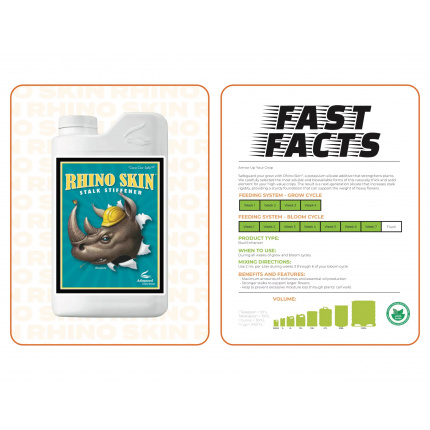 Rhino Skin je snažan dodatak ishrani za biljke na bazi kalijum silikata. Prema etiketi sadrži 0.4% rastvorljivog kalijuma (K₂O) i 0.15% silicijum dioksida (SiO₂), sa ukupno približno 0.5% silicijuma.