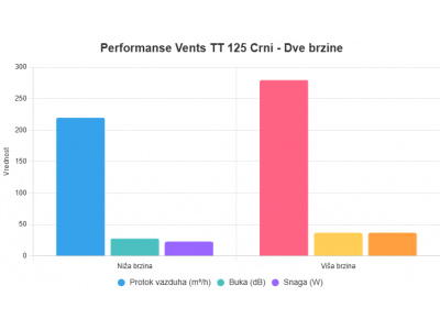 - Dve brzine: 220 m³/h (niža) / 280 m³/h (viša) – fabrički podešen na maksimum